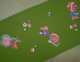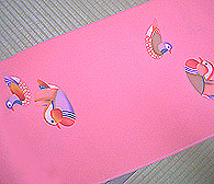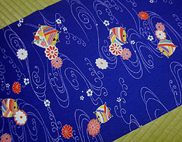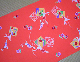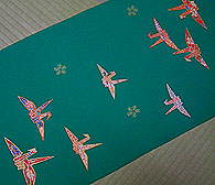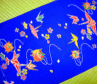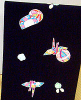 左写真k−06 折り鶴デザインきものは絹100% ちりめん地。型友禅の作品です折鶴、鞠、櫛等が描かれています |