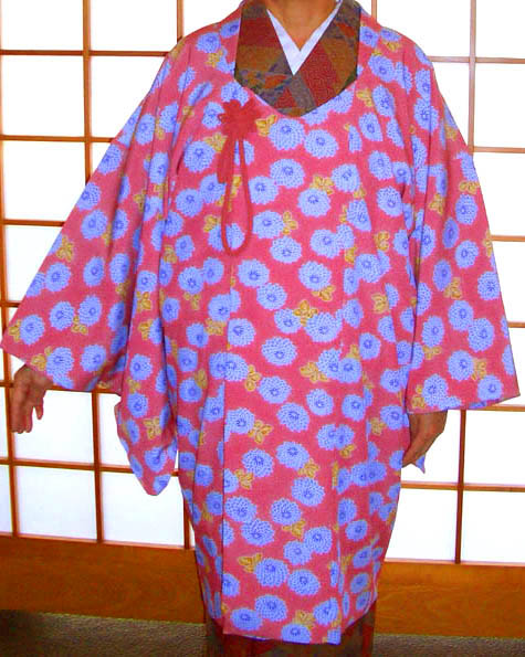 合繊きもの(レトロ調矢絣)写真は仕立て上がりのイメージ。 写真をクリックすると別画像がでます 麻の葉を詰めた矢羽根の柄のこもんは