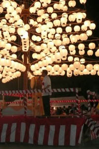 毎年7月下旬。やぐらに全高16メートルの木の柱をたて、365個の提灯を灯します。