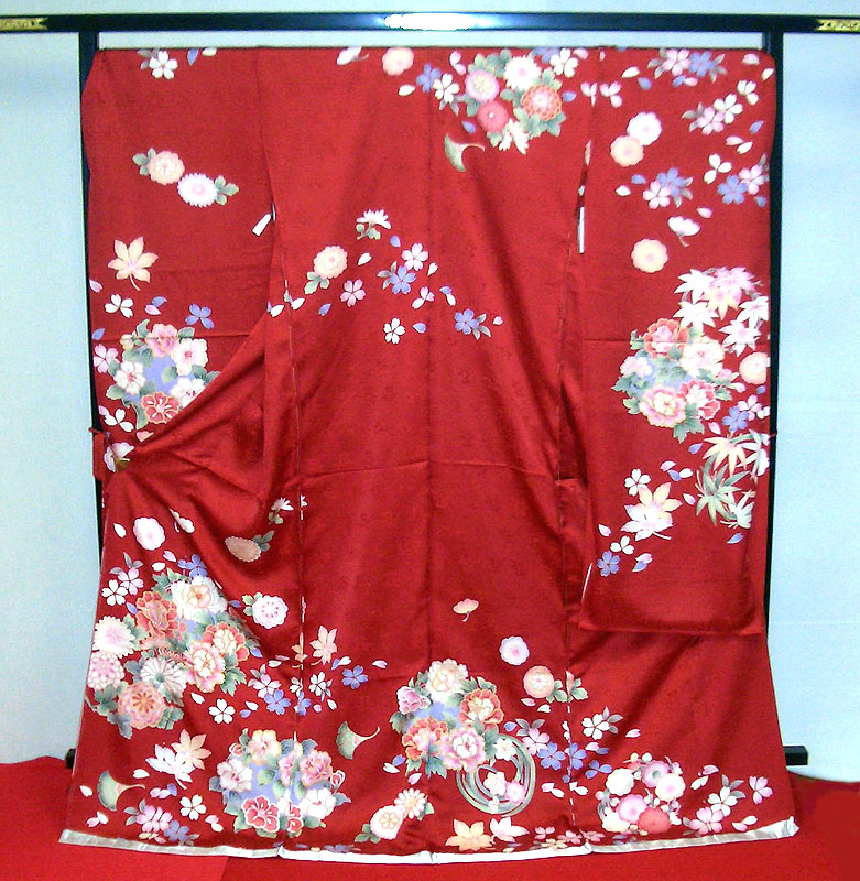 晴れ着の持つ要素と雰囲気をたっぷり入れたふりそで。若さと華やかさに可愛らしさを プラスした、人気のある仕上がりです。 やや大きめに、季節の花を彩って、写真映えも着映えもOK。 また、(画像では分かりづらいですが)本綸子の上質な生地に地織りも加えています。