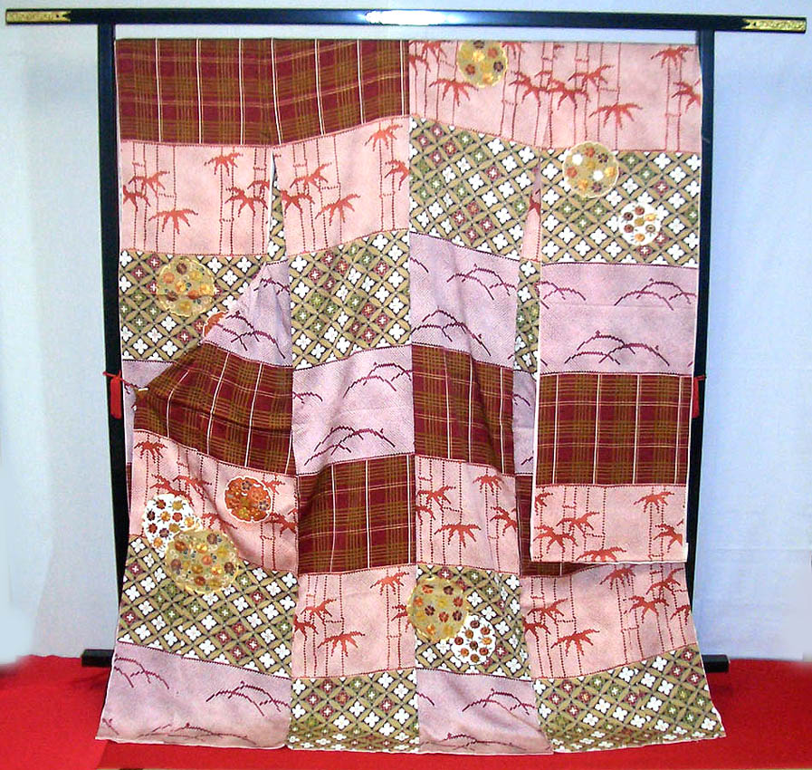 生地に総デザインを施した振袖です。華やかで個性的、とにかく、 ありふれたタイプに満足できないかたにオススメです。大きな市松取りした生地に、 手間をかけて、さまざまな加工を入れました…友禅・しぼり・刺繍…晴れ着の存在感を引き立たせています。 数枚の振袖を同時に味わえる、当店おすすめの作品です。