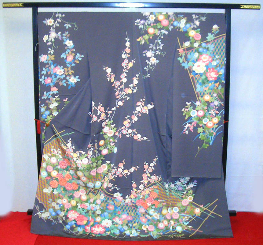 格調高い手描き友禅のふりそで。季節を彩る花々が鮮やかです。地色は珍しく明るいグレーを基調にしています。 ありきたりのカラーや流行のデザインに捕らわれない、上質でトラディショナルな作風が、 特別な晴れ着として長くご愛用いただけることでしょう。 ふんだんに入れた本格派の加工、前後ろ・左右どこからも素敵に見えて、好感度抜群。当店おすすめの作品です。
