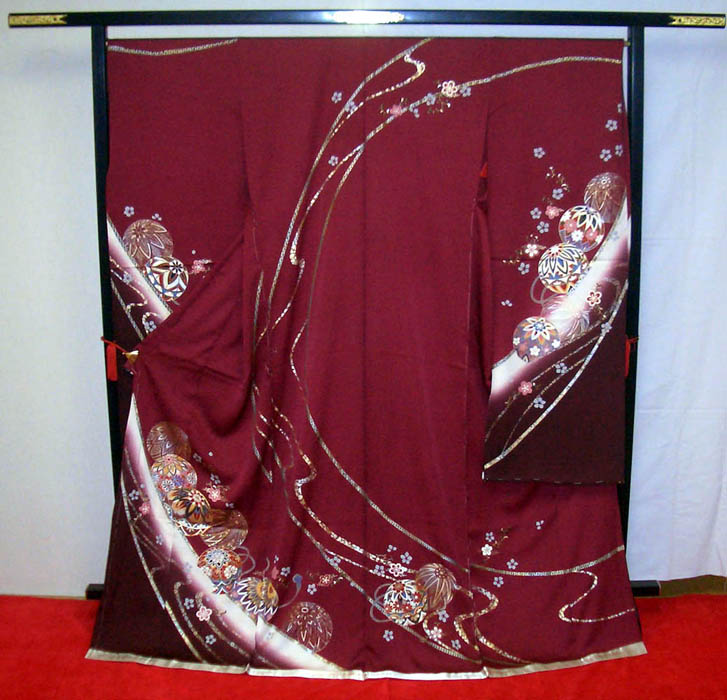 ワインレッド系の地色に金彩加工が映える、ちょっぴり大人のふりそで。 柄は古典的な「てまり」、トラディショナルなテーストをバランス良く入れました。 (両袖にも多めに柄づけして、写真映りも大変良くなっています。) 若さと落ち着きの両面を兼ね備えた一枚です。