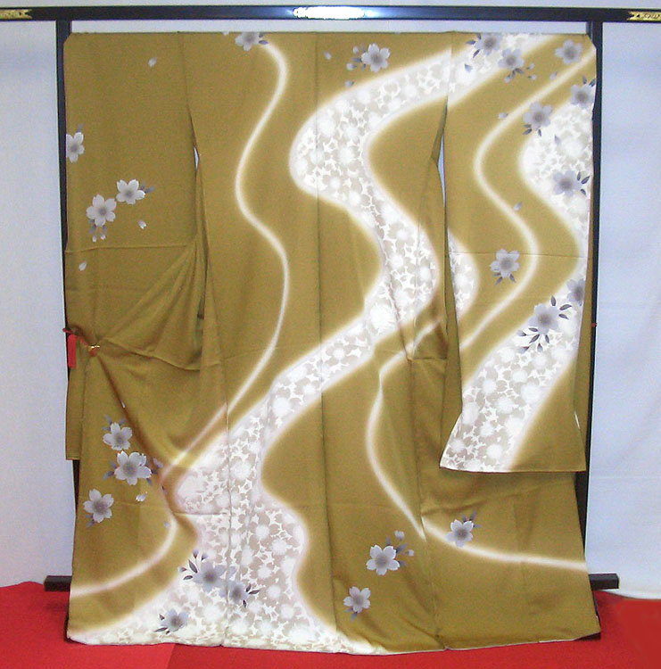 カーキの地色に「さくら」デザインのふりそで。ぼかし染めを上品に入れて