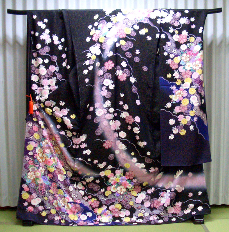 晴れ着にふさわしい華やかさを全身にデザインした、人気のブラックカラーのふりそでです。 ピンク色やイエローの可憐な花々をふんだんに入れて、かわいらしさも抜群。 また(写真では分かりにくいですが)生地にラメ糸を織り込んであるので、キラキラした仕上がりになっています。 前後ろ、左右どこからも素敵に見える、おすすめのふりそでです。