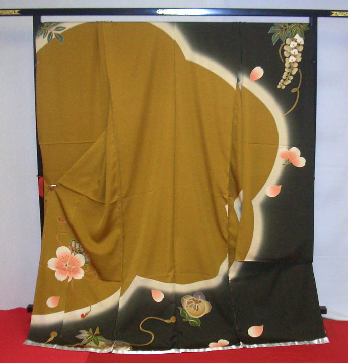 めずらしく、金茶色と黒色で染め分けた振袖です。大胆な構図は古典芸能の「歌舞伎」をお手本にしています。 トレンドの振袖とはちがう、メリハリの利いたタイプは個性的に映るでしょう。シンプルながら、印象的な着姿を実現しています。