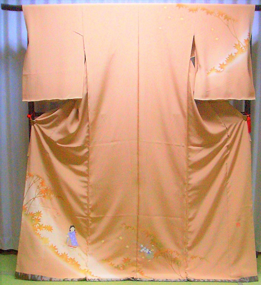 糸美屋オンラインショップ やわらかなブラウン系の地色に手描きした訪問着です。 紅葉と唐子人形という組み合わせに趣を感じます。定番のデザインとは違い、 着用季節は限定されますが、2枚目の礼装、盛装としてお勧めの作品です。 画像はかなり不鮮明です。ぜひ当店で実物を見てご試着ください。 別誂えお仕立て承ります。(胴裏、絹使用、送料込み/税別) 約2ケ月かかります。 京都友禅作家 高橋翠延