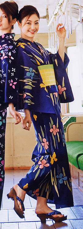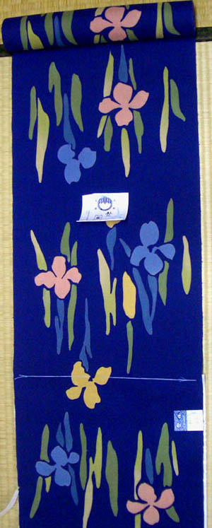 竹仙ゆかたコレクション 藍地にカラフルなショウブが染められた愛らしい浴衣です。