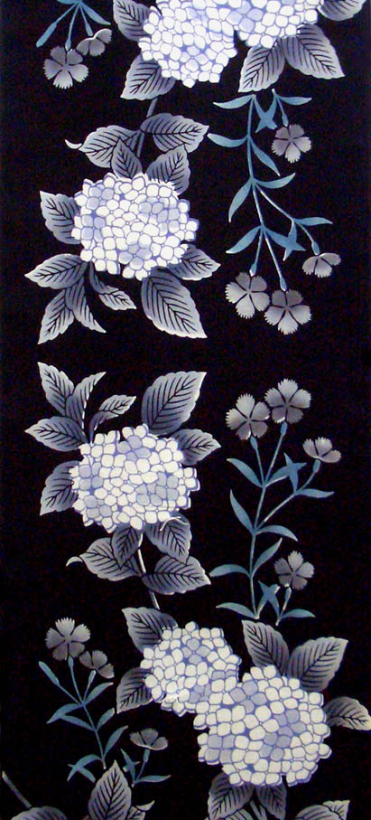 黒地に紫陽花。ところどころに撫子、ブルー・グレイ・グリーンの色使い。じつは手が込んだ浴衣で、 本染めです。(商品詳細:綿100%日本製)