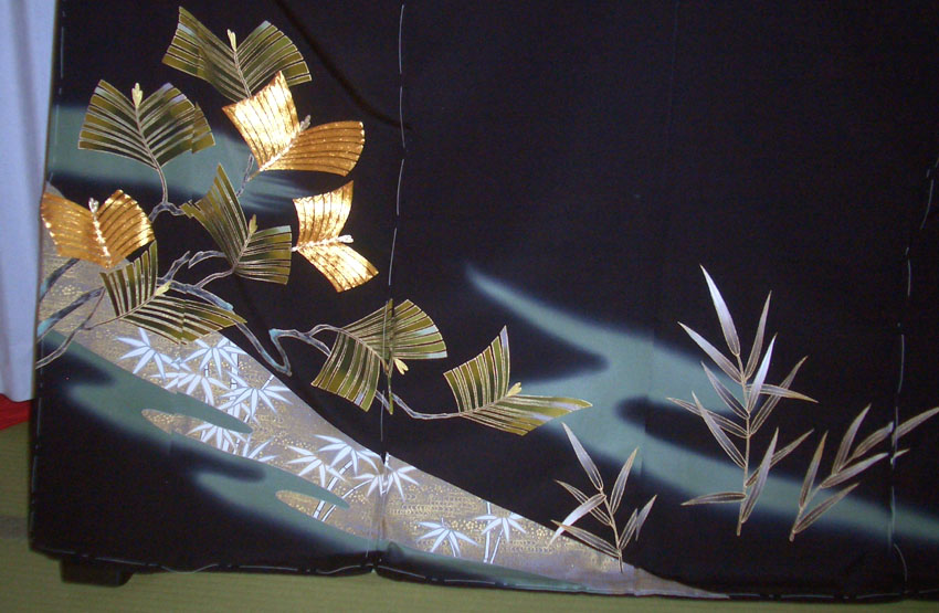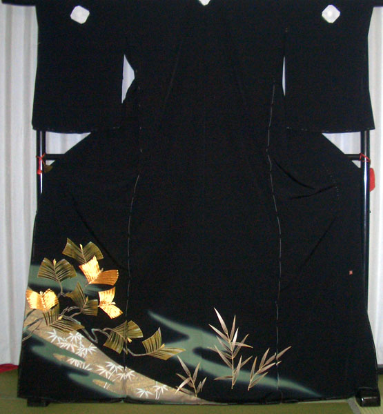 <黒留袖 逸品例> 吉祥紋様の代表格、松の葉をモチーフにした黒留袖です。 金襴刺繍をつかって豪華にデザインしました。